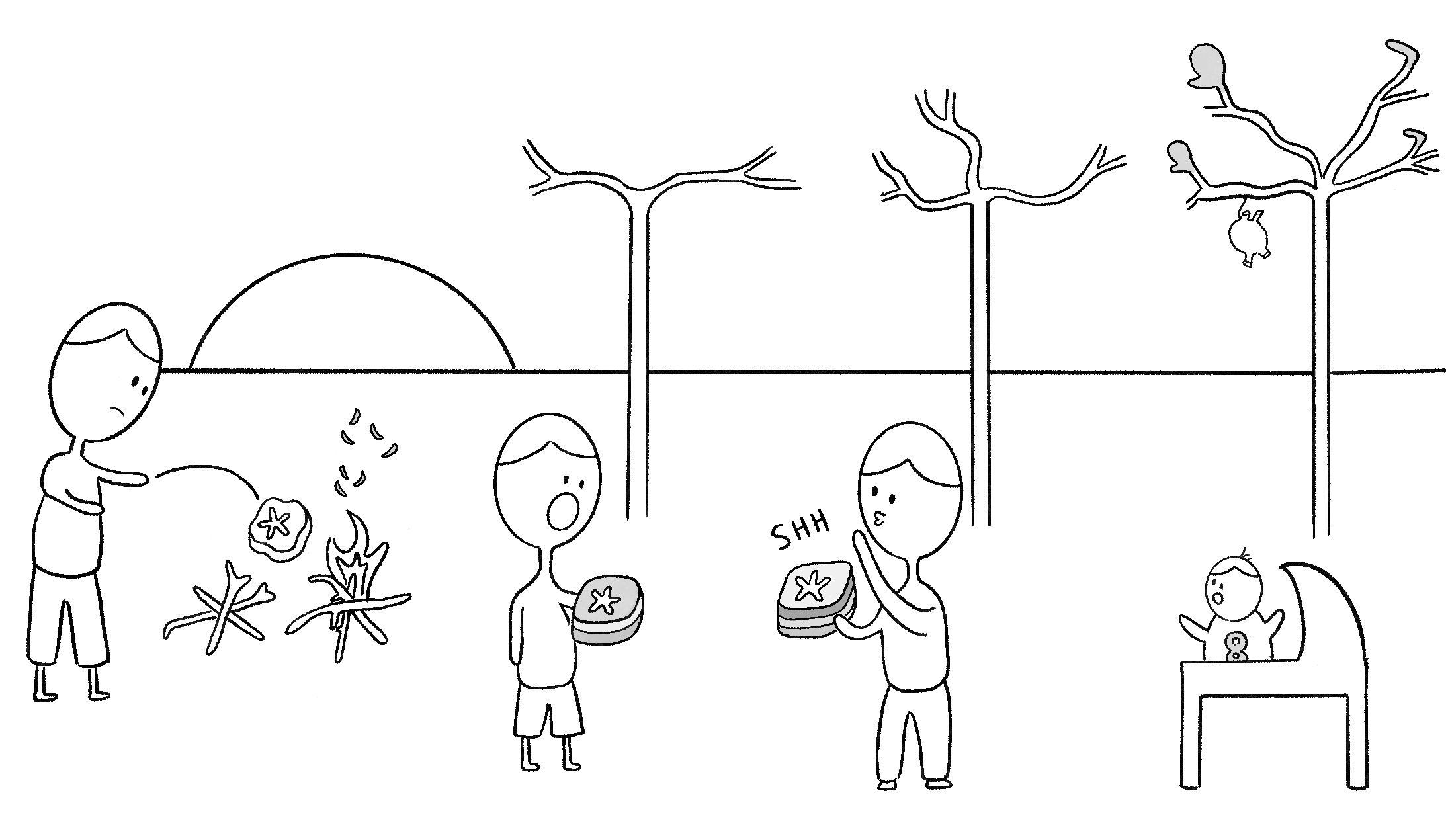 Right to him is a tree with three branches (week 3). Under that tree is a guy with a three-layer bread (In week 3, there is formation of trilaminar embryonic disc = endoderm, mesoderm, and ectoderm). Notice our guy is saying SHH (Sonic Hedgehog will induce ectoderm to become neural plate).